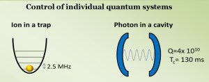 Serge Haroche developed cavity quantum electrodynamics in the microwave regime. Among other impressive accomplishments, his group has performed “nondemolition” measurements of the number of photons stored in a cavity (that is, the photons can be counted without any of the photons being absorbed). The measurement is done by preparing a Rubidium atom in a superposition of two quantum states. As the Rb atom traverses the cavity, the energy splitting of these two states is slightly perturbed by the cavity’s quantized electromagnetic field, resulting in a detectable phase shift that depends on the number of photons present. (Caltech’s Jeff Kimble, the Director of IQIM, has pioneered the development of analogous capabilities for optical photons.) Continue reading →